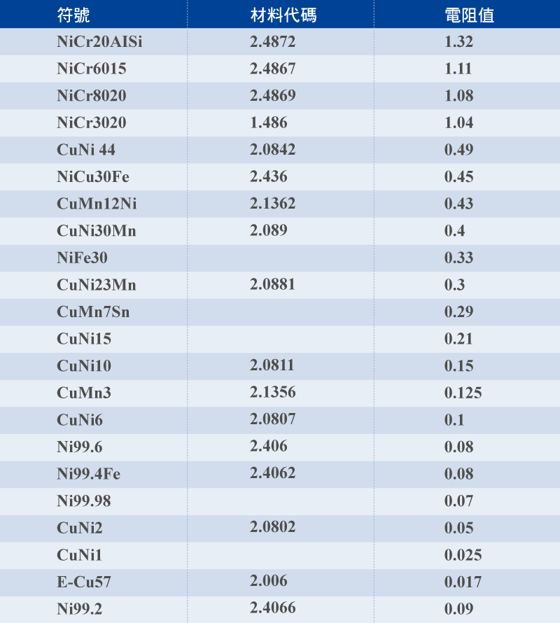 根據不同客戶的需求,我們提供各款式電阻合金材料如︰合金編織絲、合金扁線、合金帶、合金板以及合金箔材。主要運用在電阻器生產、3C電子產品中電流量測、設備自動化及控制系統的使用。其他如:加熱電纜(地板加熱,、屋頂排水溝加熱,、電暖被等)、熱插頭、溫度傳感器及焊絲等。