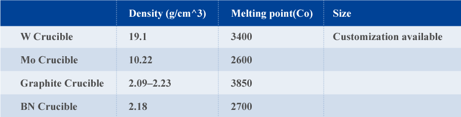 (1) Crucible and boats in different materials, such as Tungsten(W), Molybdenum(Mo), Boron Nitride(BN), graphite etc.